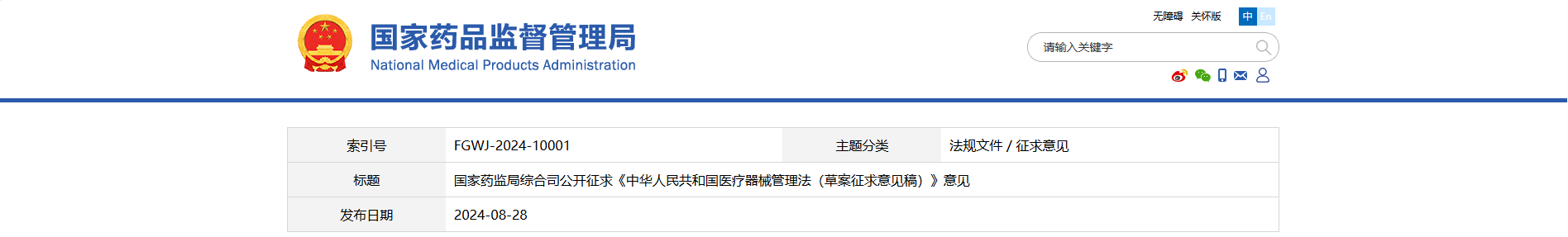 8月28日,國家藥監局綜合司發布了公開征求《中華人民共和國醫療器械管理法(草案征求意見稿)》(以下簡稱《征求意見稿》)的公告,意見反饋截止時間為2024年9月28日。